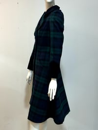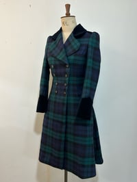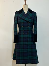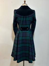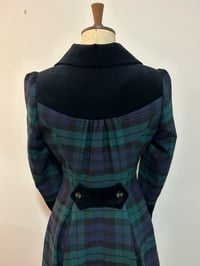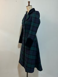 This is a beautiful, elegant and dramatic dress coat. It is lightweight so can be worn as either a coat or tailored dress. The cuffs, collar and back tab are made in soft cotton velvet. It has a full skirt and shaped front pockets. Fully lined and dry clean only.