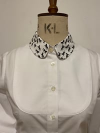 This smart and chic tailored shirt is 100% cotton with a double bib front and hand printed ponies on collar and cuffs.