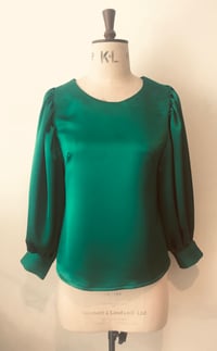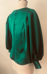 Stunning and dramatic satin top with statement balloon sleeves. Dress up slim trousers or tuck in to our pencil skirt or high waist trousers for a beautiful and dramatic silhouette.